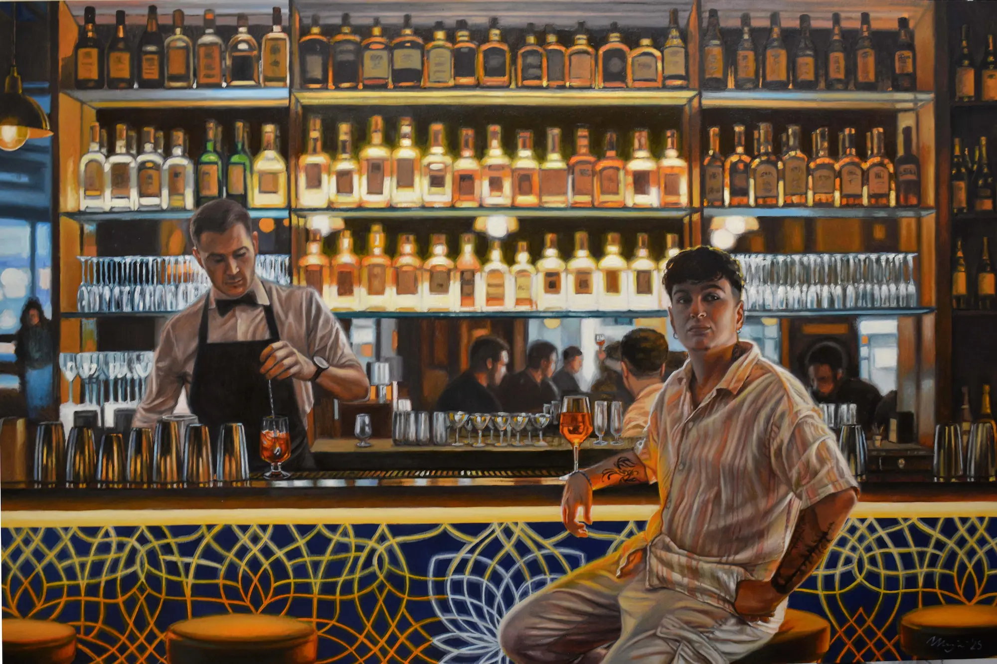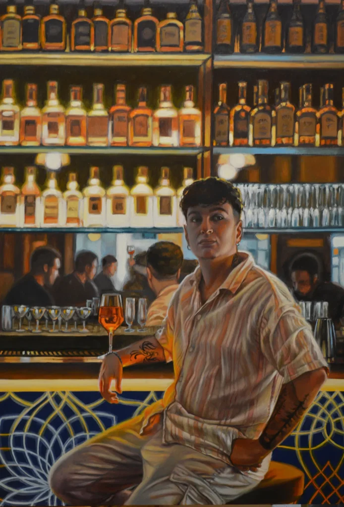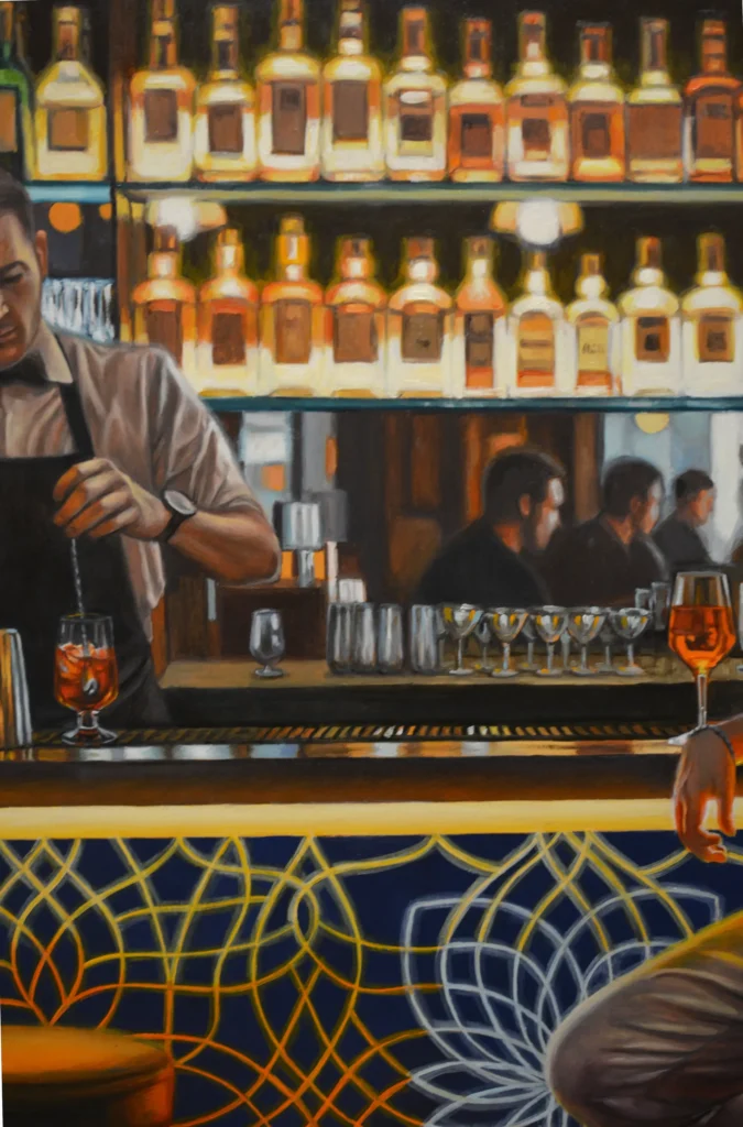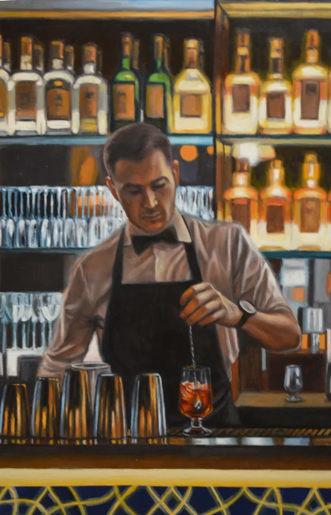 Dietro ogni bancone c’è chi osserva senza giudicare. Il barista vede passare storie, persone che si incontrano, altre che si allontanano, gente che ha voglia di parlare. Ogni sera, tra bicchieri e bottiglie di ogni tipo, è testimone di tutta questa socialità… eppure non si tratta di reale compagnia. In questo quadro non si sa bene chi sia più solo: se lui, immerso tra la gente, o il ragazzo ignorato dai suoi amici.